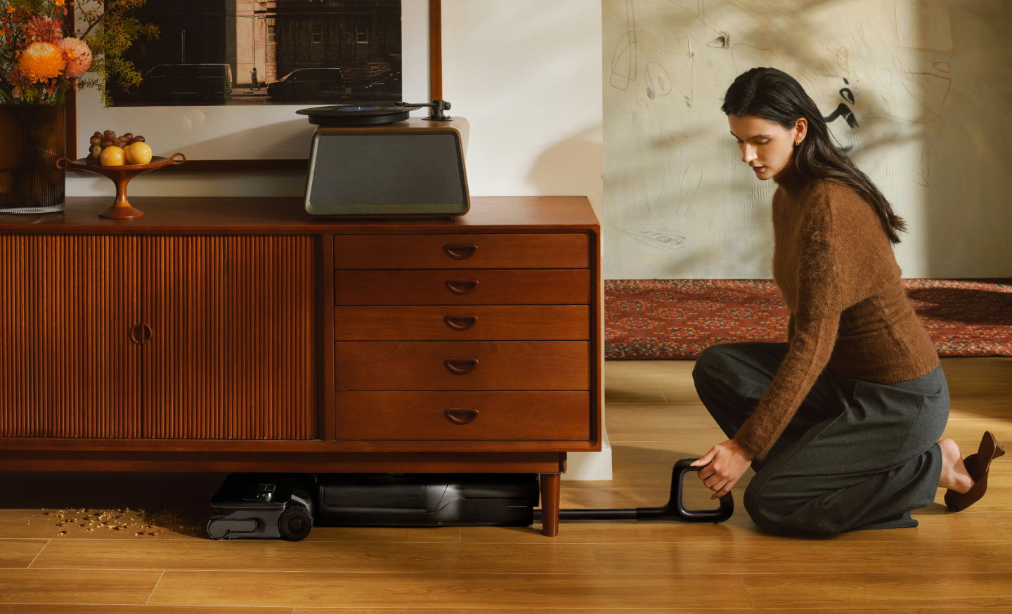Mit einer Höhe von gerade einmal 12,5 cm¹⁹ gleitet er spielerisch leicht unter Möbel wie Betten oder Sofas.