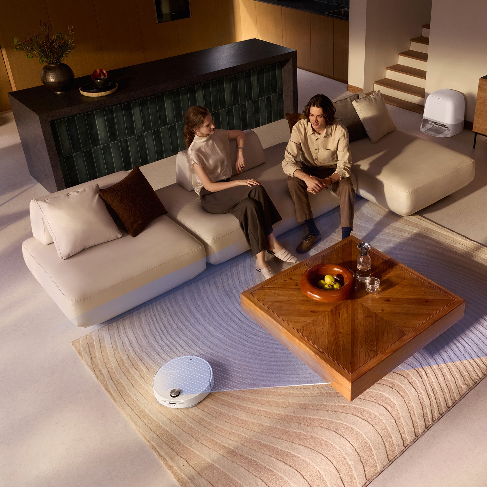 In offenen Räumen Der LiDAR-Sensor ist ausgefahren und ermöglicht einen 360°-Panoramascan, um das Zuhause punktgenau abzubilden und die effizienteste Reinigungsroute zu ermitteln. Unter niedrigen Möbeln Der LiDAR-Sensor fährt automatisch ein und schaltet zu einem Sichtfeld von 100° nach hinten um – präzise abgestimmt auf enge Räume.