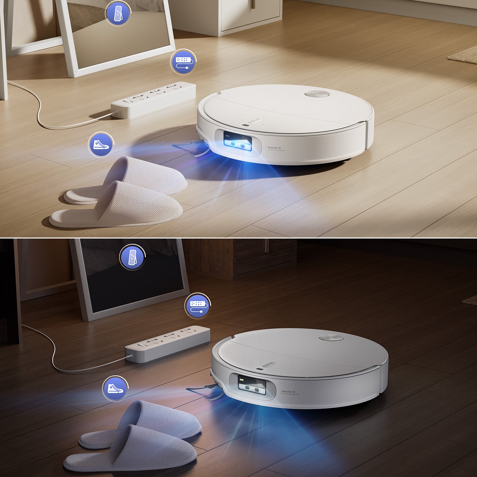 Mit strukturiertem Licht und einer RGB-Kamera kann der Roboter 108 Arten von Objekten12 auf intelligente Weise erkennen und ihnen ausweichen. Er umgeht Hindernisse sowohl in gut beleuchteten als auch in dunklen Räumen, ohne dass der Boden vorher aufgeräumt werden müsste.