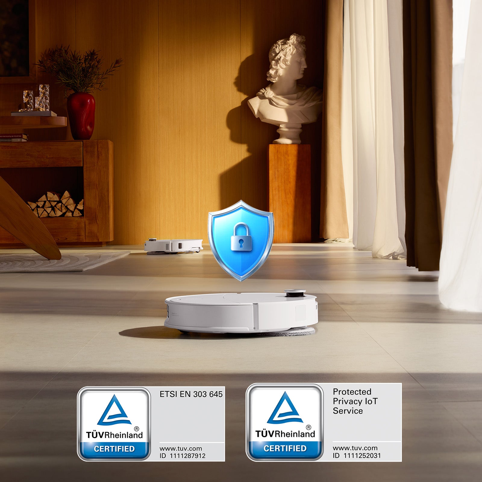 Mit dem Schwerpunkt auf Datenschutz und Sicherheit werden durch den Qrevo CurvX garantiert keine Bilder gespeichert. Er kann eine Zertifizierung des TÜV Rheinland als sicheres, smartes Haushaltsgerät vorweisen und erfüllt die Cybersecurity-Normen von ETSI EN 303 645.