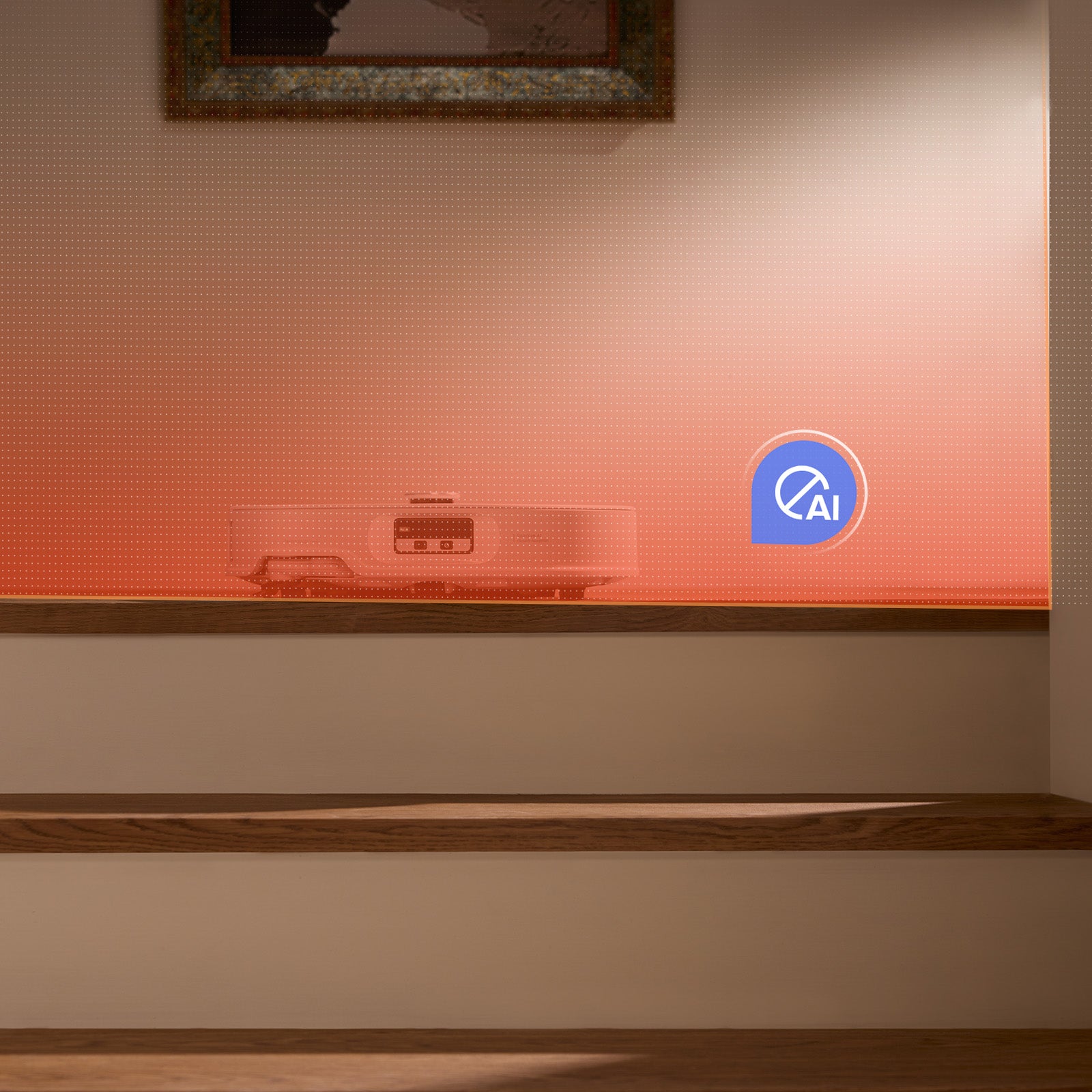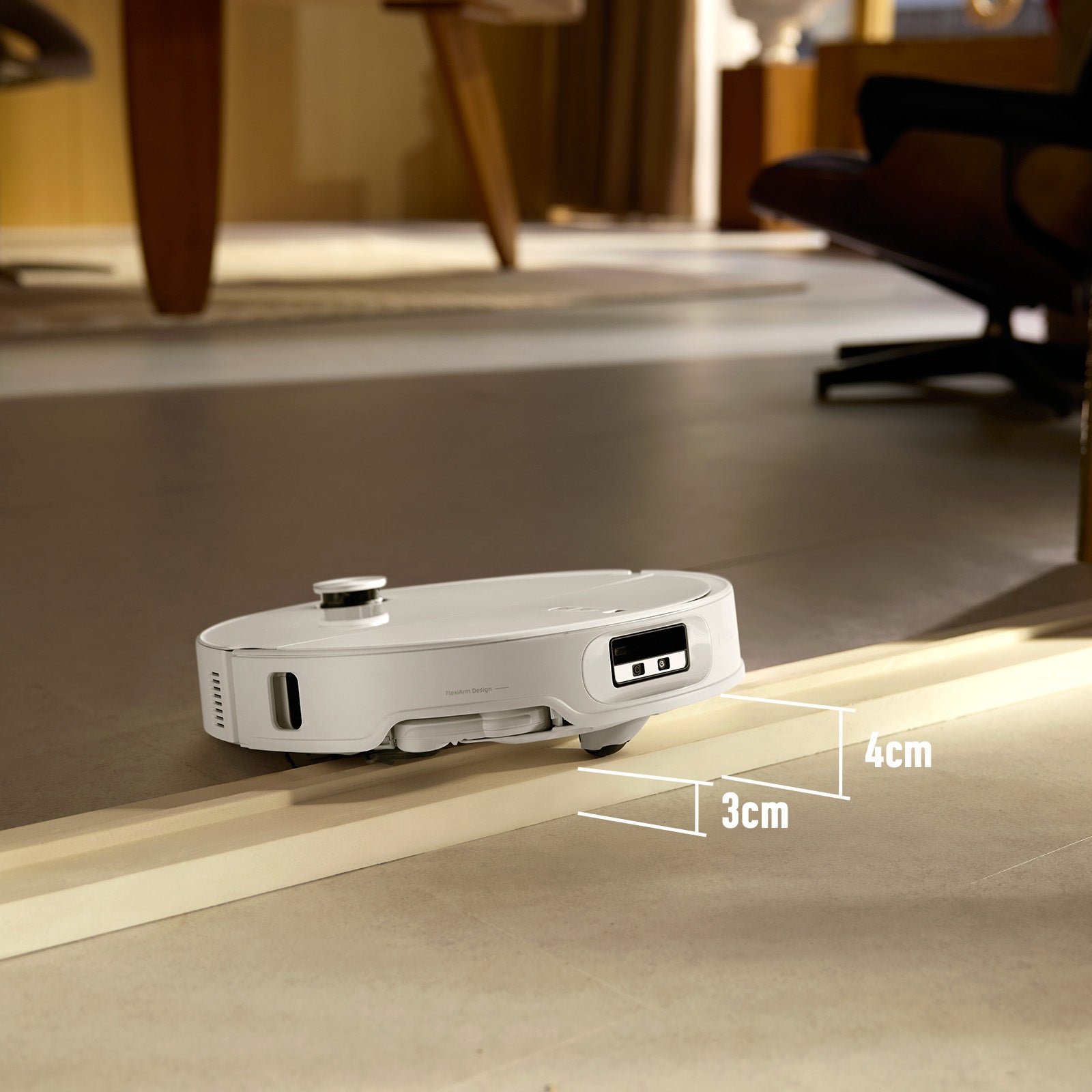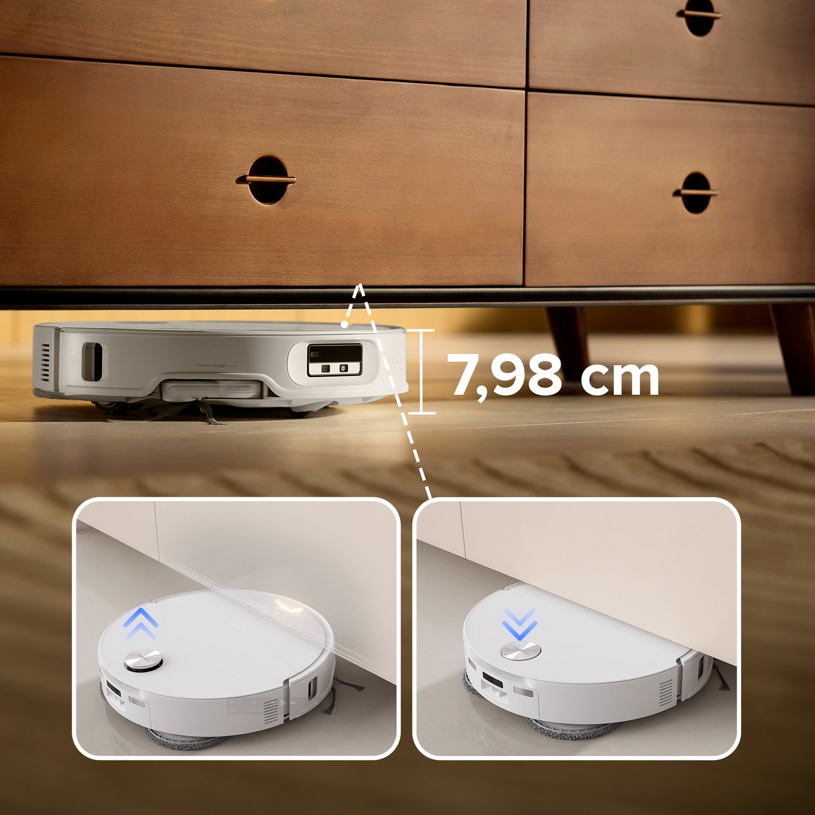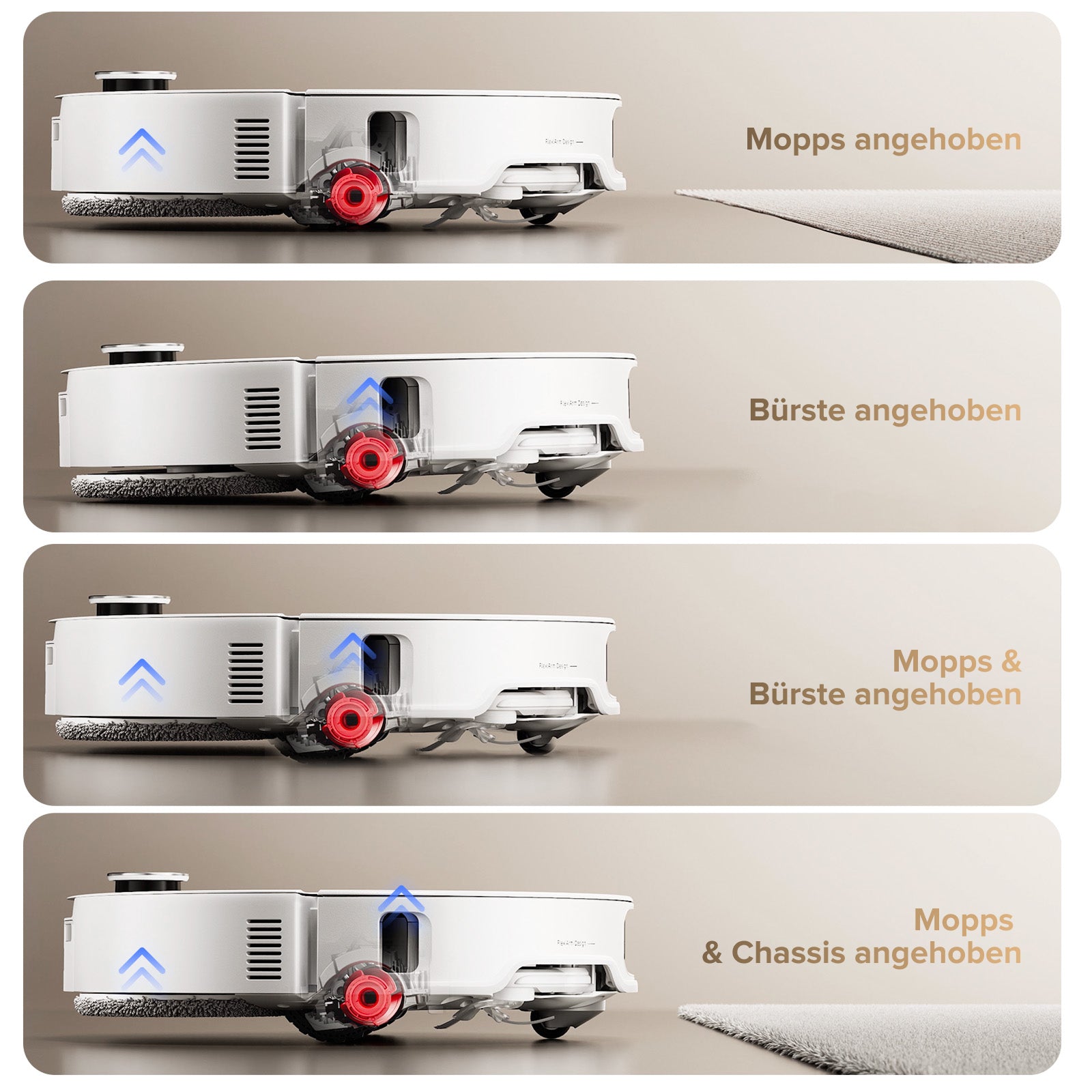 Das AdaptiLift™ Chassis bietet ein neues Maß an Vielseitigkeit. Es gibt dem Roboter die Möglichkeit, sein gesamtes Chassis anzuheben oder einzelne Abschnitte – vorne, hinten, links oder rechts – je nach Terrain. Egal, ob er hohe Schwellen überwindet oder mühelos um Möbelbeine herum manövriert, er passt sich dem Layout deines Zuhauses nahtlos an und ermöglicht eine reibungslose, ununterbrochene Reinigung.