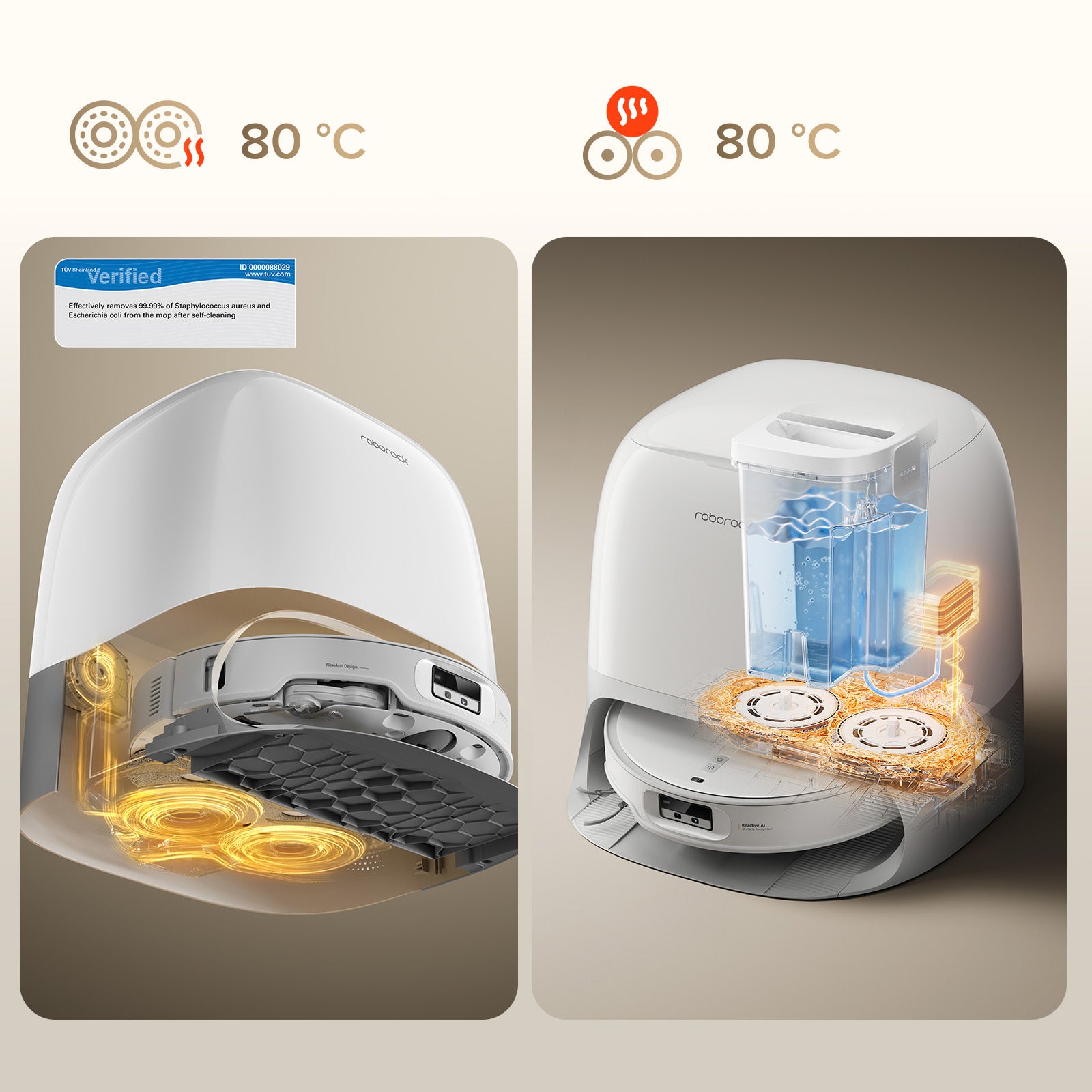 Hygienische und saubere Wischmopps, wenn der Roborock seine Tour beginnt. Wie das geht? Mit 80 °C heißem Wasser13, um hartnäckige Flecken und Fett zu lösen. • 99,99 % Entfernungsrate der Bakterien14 • Modus Waschen: Intelligent / Leicht / Mittel / Intensiv • Wassertemperatur: Raum / Warm / Heiß