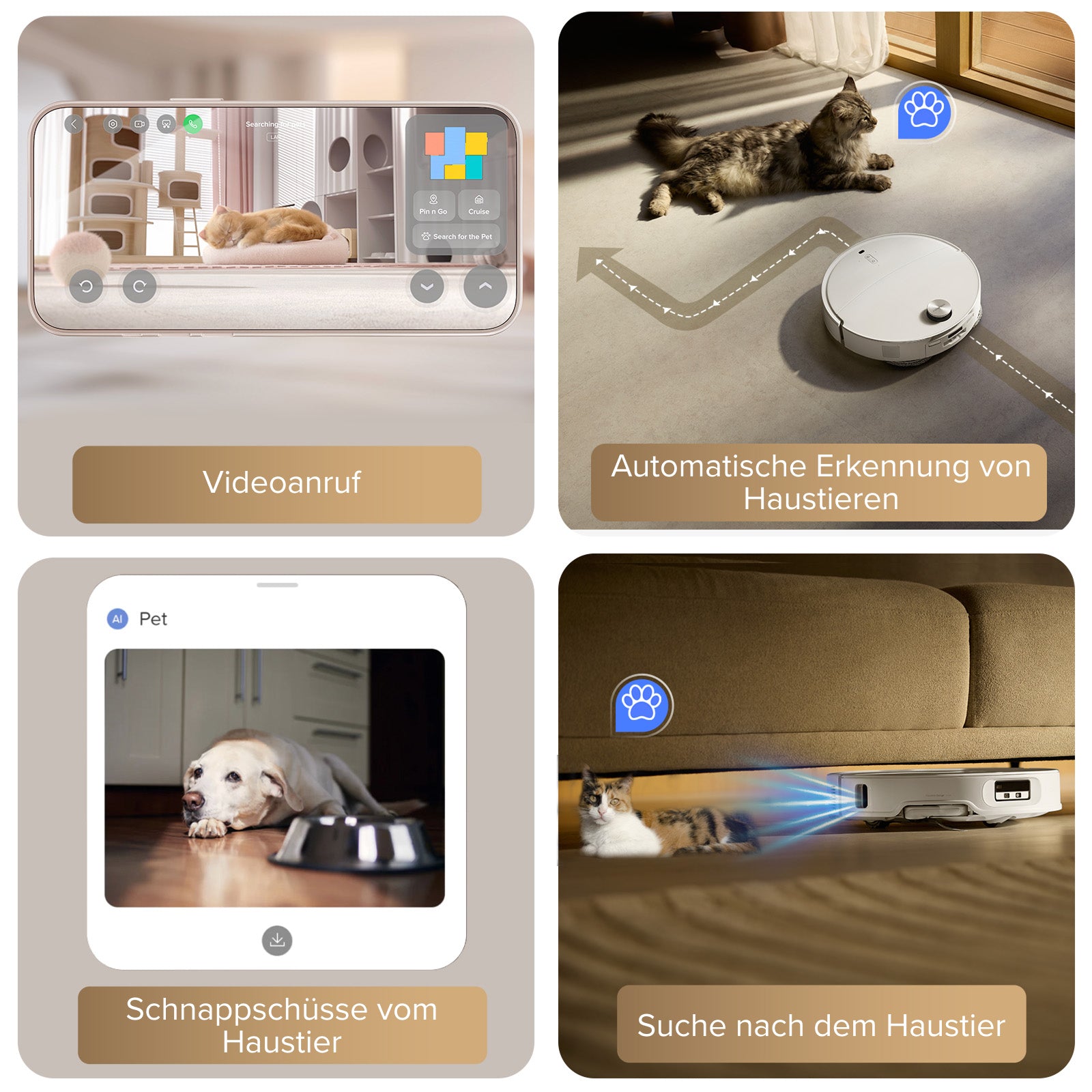 Videoanruf Videoanrufe in Echtzeit und Zwei-Wege-Sprachinteraktion. Automatische Erkennung von Haustieren Wenn sich der Roboter Kätzchen oder Welpen nähert, schaltet er sofort seine Hauptbürste aus und fährt zur Seite. Schnappschüsse vom Haustier Der Roboter kann tolle Schnappschüsse deiner Haustiere während der Reinigung aufnehmen (verfügbar zum Herunterladen). Suche nach dem Haustier Der Roboter kann automatisch nach Haustieren suchen und findet sie auch in ihren Verstecken.