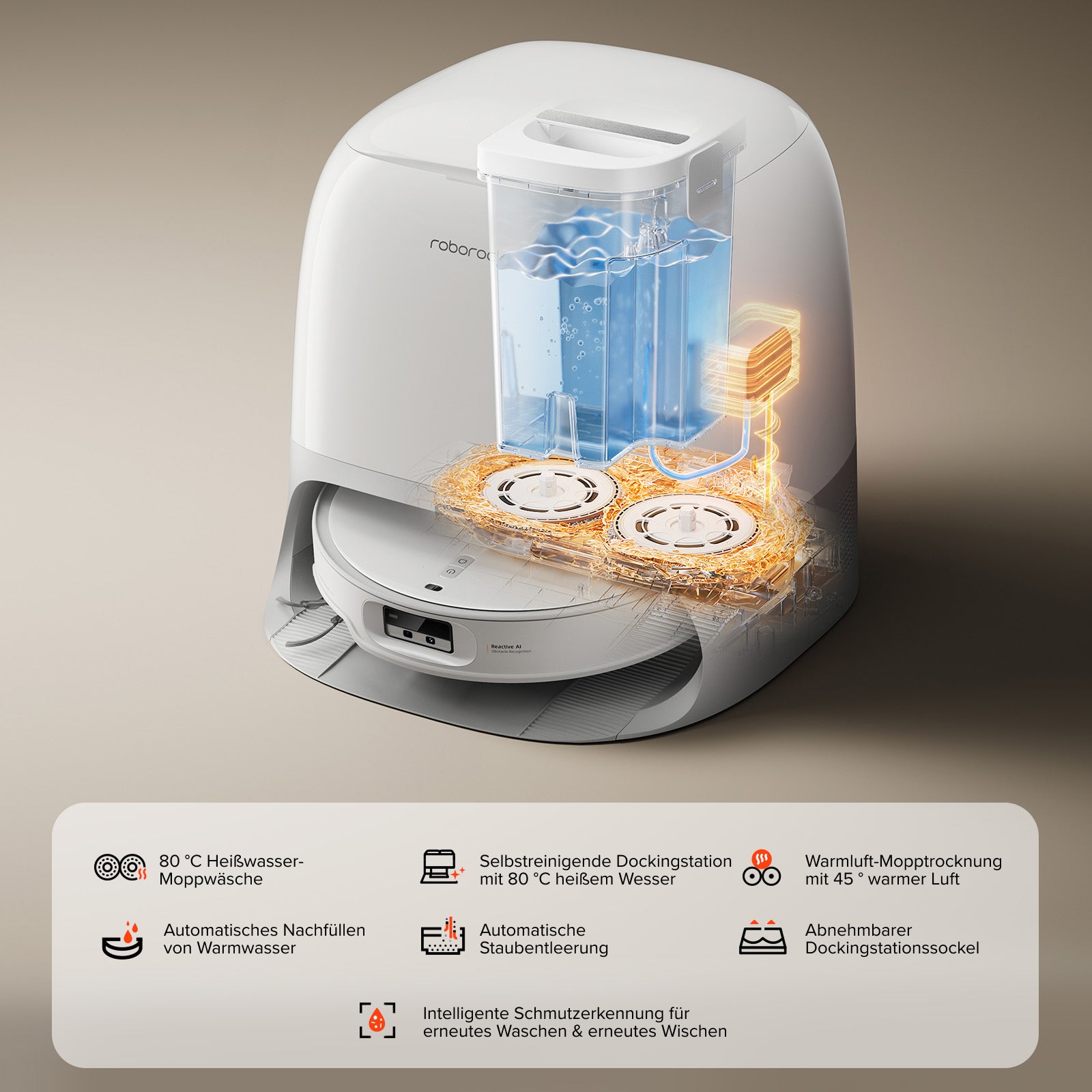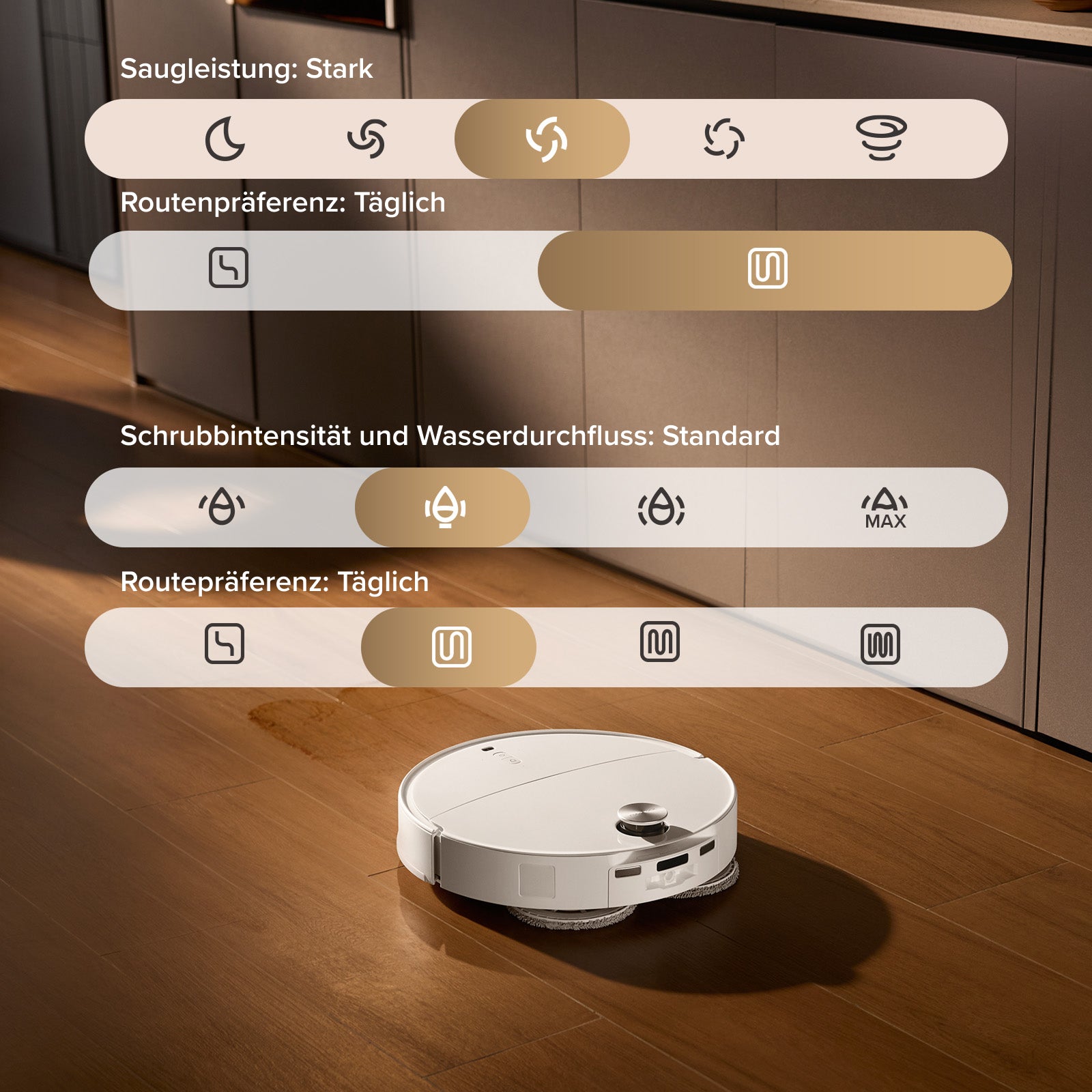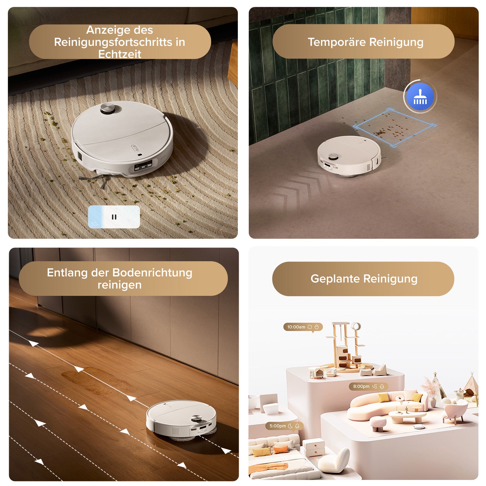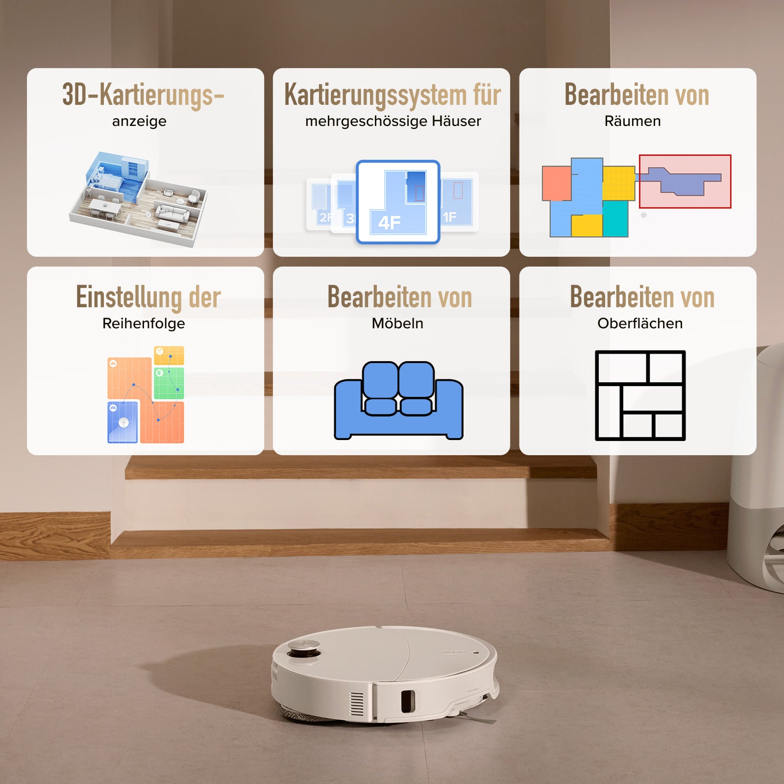 1. HyperCleaning System - 22.000Pa HyperForce®-Saugkraft - 6400 mAh Akkukapazität.- Anti-Verwirrungs-System: DuoDivide Bürste + FlexiArm™ Seitenbürste - 12N Pressurized Mopping + Warmwasserwischen 2. AdaptiLift™-Fahrgestell - Der Roboter hebt automatisch das Kugelrad oder das Hauptrad an, um Standardschwellen bis zu 3 cm und komplexe doppelschichtige Schwellen bis zu 4 cm zu bewältigen3. Flächendeckendes Design - 7,98 cm ultra-schlankes Design - FlexiArm Design™ Seitenbürste & Mop sorgen für eine bessere Kantenreinigung.4. Navigation & HindernisvermeidungHebbarer LDS mit Aufwärtssensor, strukturiertem Licht, verbesserten Wanderkennungssensoren, ToF-Klippensensoren und RGB-Kamera für präzise Navigation und Hindernisvermeidung.5. Multifunktions-Dock. - 80°C / 176°F Heißwasser-Mop-Wäsche und 80°C / 176°F Heißwasser-Dock Selbstreinigung - WarmwasserAutomatische Nachfüllung - Intelligente Schmutzerkennung für Re-Wash & Re-Mop - 45°C / 113°F Warmlufttrocknung - Automatisches Entleeren von Staub