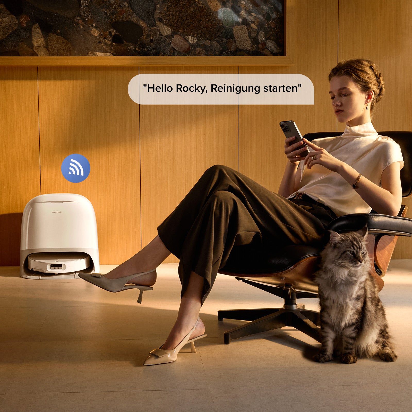 Sag einfach "Hello Rocky", um Reinigungsarbeiten zu starten oder die Einstellungen anzupassen – du musst keinen Finger rühren. Dein intelligenter Sprachassistent ist jederzeit bereit zu helfen, auch ohne Internetverbindung. "Hier reinigen" "Reinige die Küche" "Nur saugen"