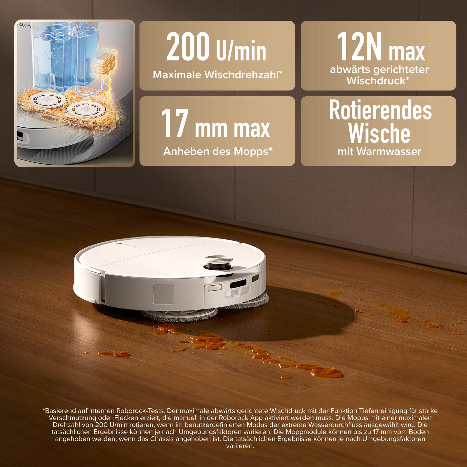 5. Basierend auf internen Roborock-Tests wird der maximale abwärts gerichtete Wischdruck mit der Funktion Tiefenreinigung für starke Verschmutzung oder Flecken erreicht, die manuell in der Roborock App aktiviert werden muss. Die tatsächlichen Ergebnisse können je nach Umgebungsfaktoren variieren.