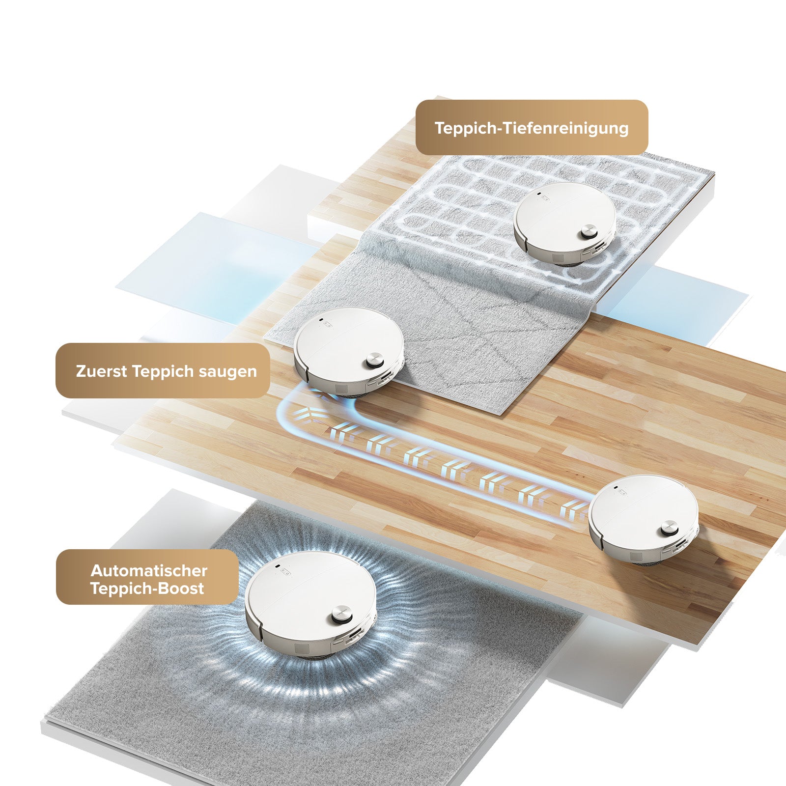 Automatischer Teppich-Boost: Maximale Saugkraft auf Teppichen. Teppich-Tiefenreinigung: Reinigt den Teppich zweimal für jeden Raum. Zuerst Teppich saugen: Sauge den Teppich zuerst, bei trockenem Mopp. Starte dann mit dem Wischen.